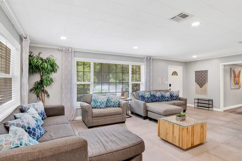 – 65in 4K Smart Samsung TV in the living room with 2 seating areas
