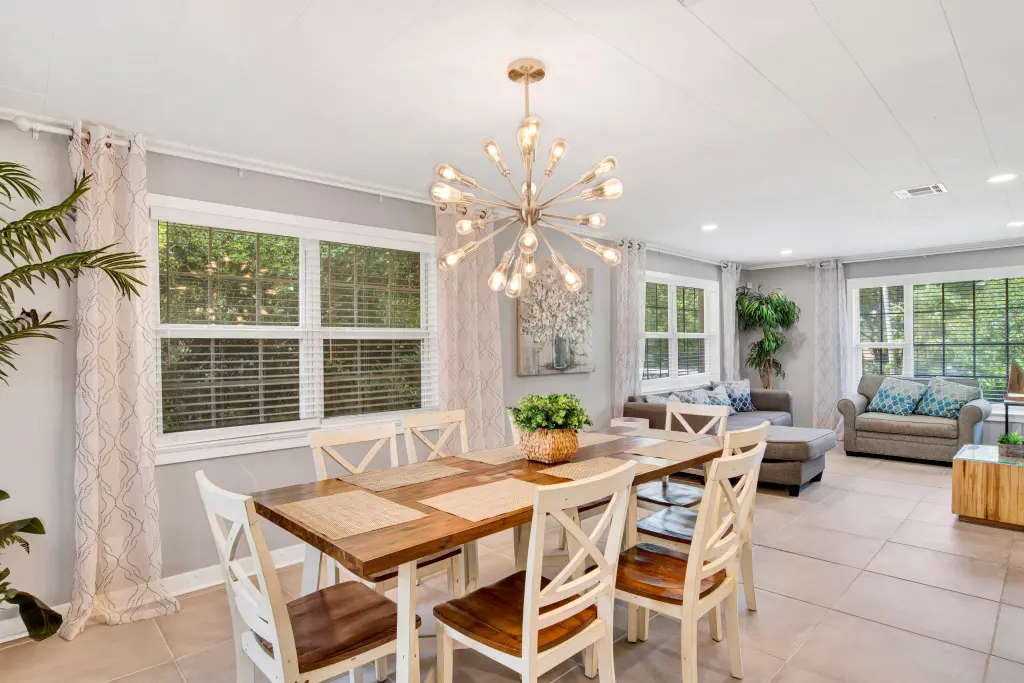 – Long dining table that can fit 6-8, plus 4 extra bar counter spots, be delighted with our dining lights
