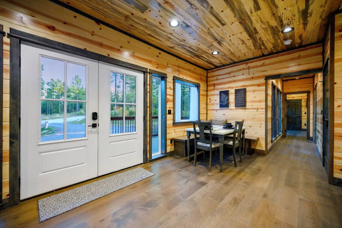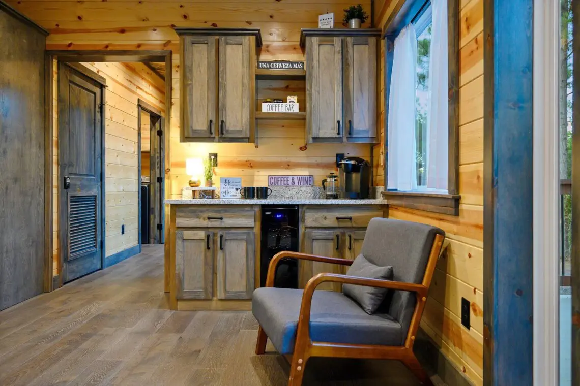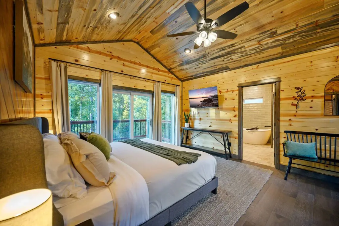 This private retreat features a king-size bed with a premium mattress and bedding, a large Smart TV, and a spa-like en-suite bathroom with a luxury shower and freestanding tub. Guests can also enjoy outdoor patio seating at both the front and rear of the cabin.