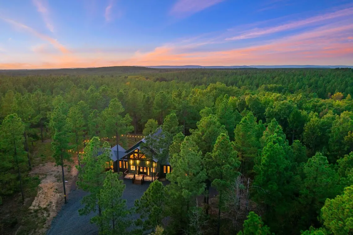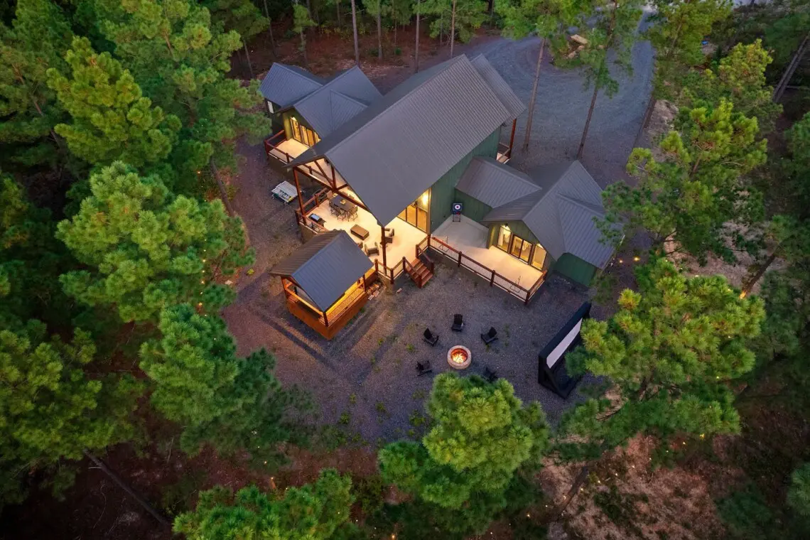 Perfect for families looking for no neighbors, this new 2-story cabin on 1 acre sleeps 10. Enjoy 2 king bedrooms, 3 luxury baths, and a loft with bunk beds and full-size mattresses. Relax in the master’s freestanding tub or have fun with the foosball table. Outside, unwind in the hot tub, watch movies on the outdoor projector, and gather by the firepit. Just a 15-minute drive to town’s entertainment, it’s ideal for both a relaxing night in or adventure on the town!