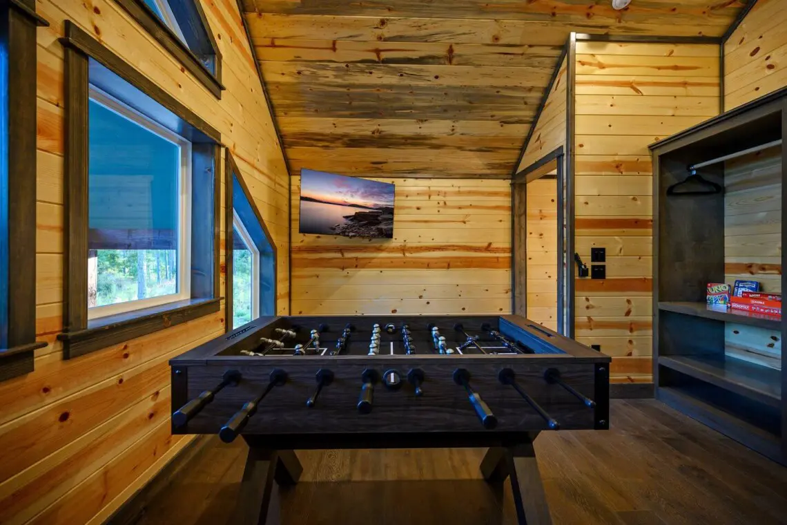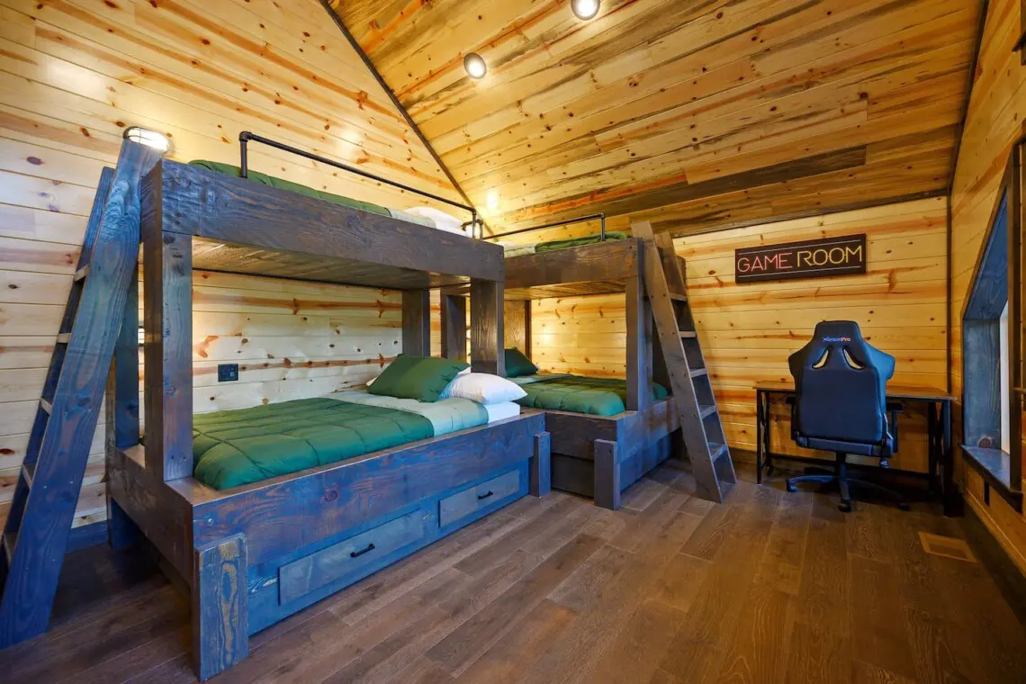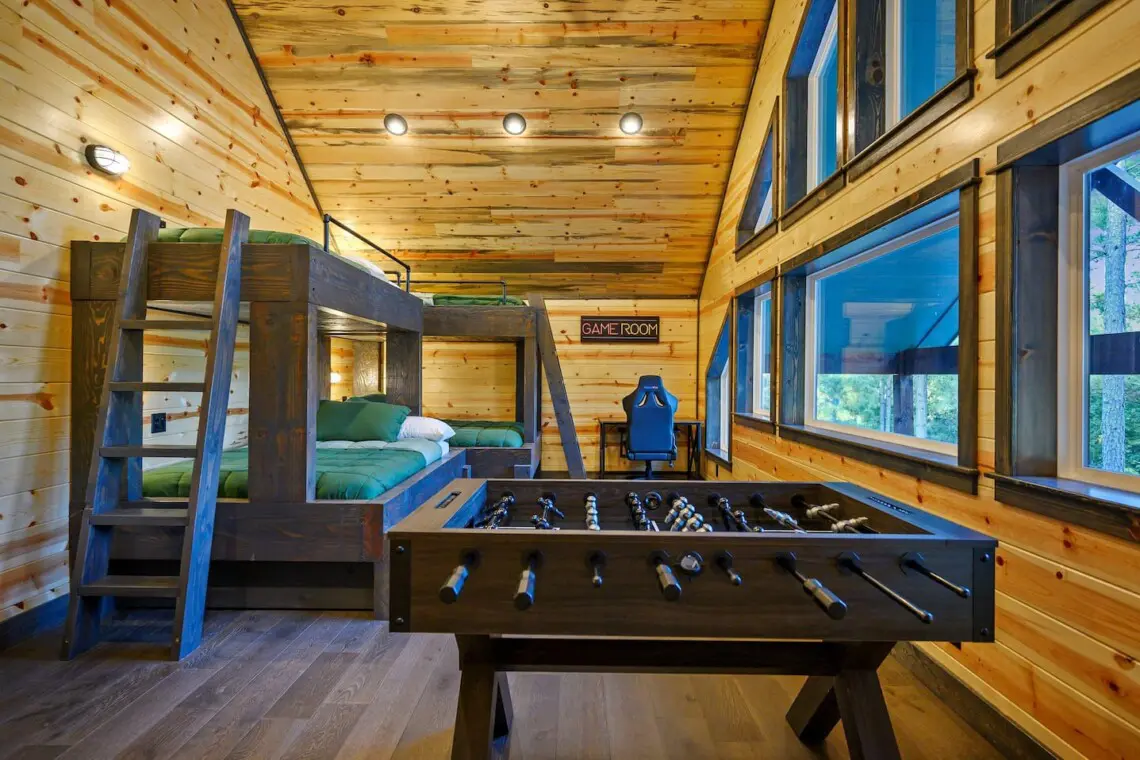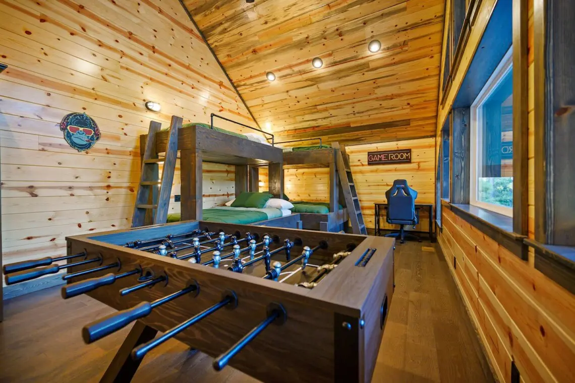 -Perfect for kids or extra guests, the bunk room includes two built-in bunk beds with twin beds on top and full beds on the bottom, all with premium mattresses and bedding. A foosball table adds an extra layer of fun.