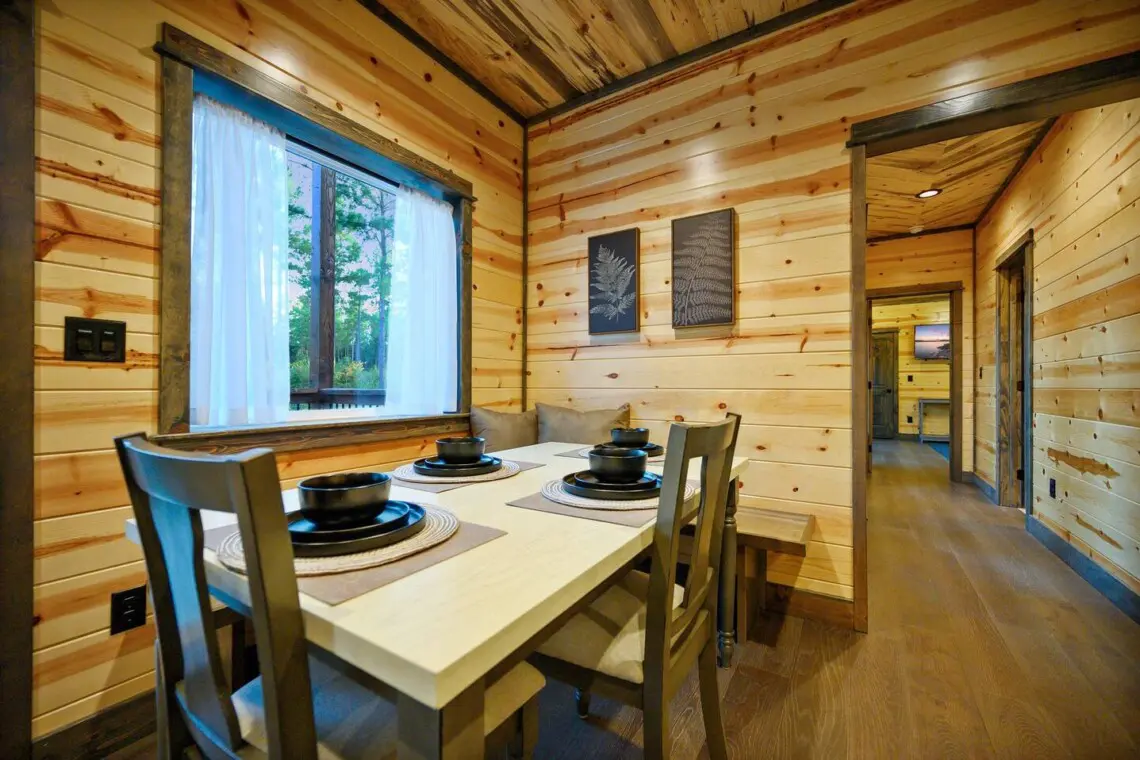 -The dining area features a large table that comfortably seats six, with room for up to eight if needed—ideal for shared meals, games, or planning the next day’s adventures.